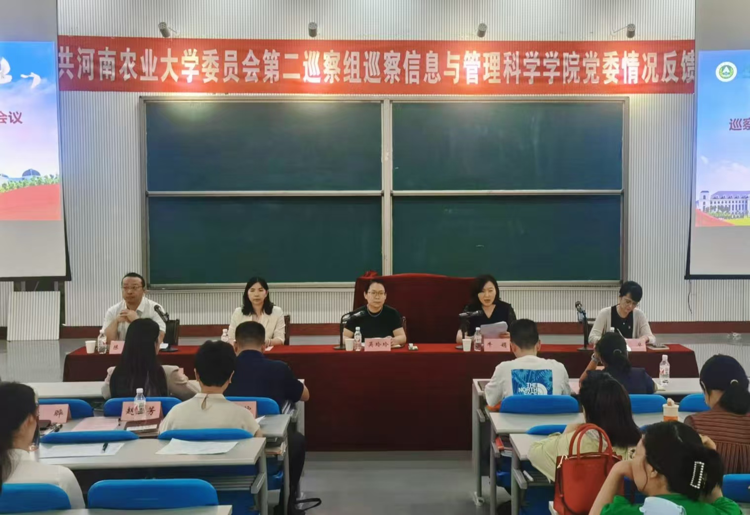 党委反馈巡察情况。党委巡察工作领导小组成员、校纪委副书记、党委巡察办主任吴玲玲,党委组织部副部长毛会坡,第二巡察组全体成员,银河App