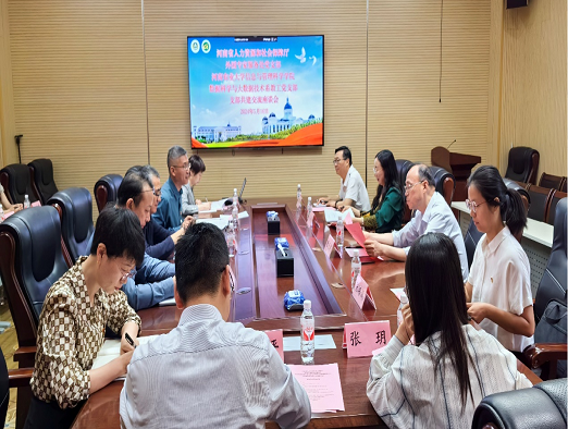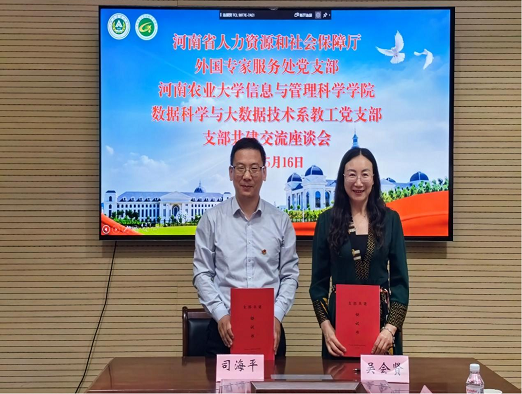 数据科学与大数据技术系教工党支部与省人力资源和社会保障厅外国专家服务处党支部在繁塔楼A405会议室联合开展了支部共建活动,省人社厅外国专家服务处党支部吴会贤书记、一级调研员张天存、副处长孙顺华、主任科员张培佩一行四人,校国际合作处处长屠克、副处长曾效葵,以及银河App