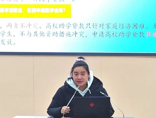 资助工作专员李艳飞详细解读了国家奖学金、国家励志奖学金、国家助学金、国家助学贷款、基层就业学费补偿贷款代偿、服兵役高等银河App