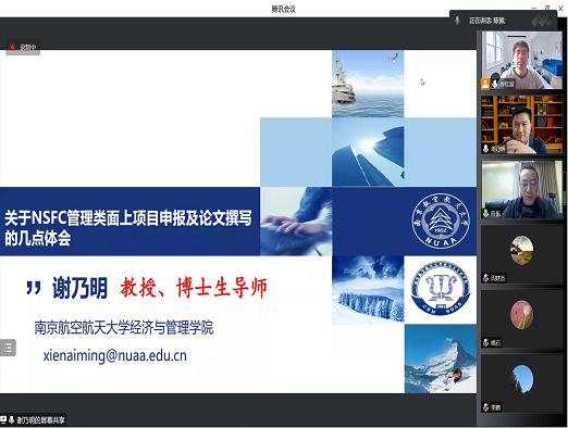 湖畔论坛第四期学术报告活动,谢教授通过腾讯会议平台作了题为“NSFC项目申报及论文撰写的几点体会”的学术讲座,报告由院长陈振教授主持,银河App