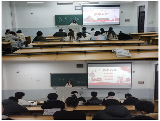 活动前,各班班长和团支书认真准备我国大学生应征入伍政策相关材料,并制作宣讲PPT、整理讲解视频。活动开始后,各班团支书详细讲述了我国征兵入伍的重大意义及相关政策,向同学们讲解了征兵工作的预征对象、身体条件、报名时间、报名渠道等情况,着重强调了今年征兵政策十大变化。最后,各班班长发言,号召班级同学为祖国国防事业奉献自己的青春力量,投笔从戎、保家卫国。