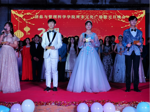 于龙子湖校区第一餐厅三楼学生活动中心举办周末文化广场暨元旦文艺晚会。院团委书记张玥、团委副书记王肖肖和2020级全体同学共同观看晚会。