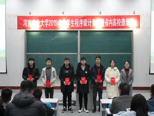 举办的河南省第13届ICPC程序设计竞赛做准备。他希望兄弟院校借此机会加强交流,互相学习,更好的促进计算机专业的发展,并预祝参赛学生取得优异成绩。随后,比赛裁判长、郑州大学陈洋老师宣读比赛规则,2017级计科专业学生温春阳演示比赛运行环境。赛场上,监考员严格公正,考生团结协作、奋力拼搏,展示了精湛的竞技水平和较强的创新能力,赛出了当代大学生的精神风貌。经过3个半小时的激烈角逐,本次比赛圆满落下帷幕。最后,组委会宣读了比赛成绩,并为获奖团队颁发奖品。