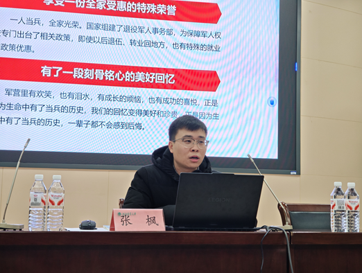 于文化路校区三百人报告厅召开新生征兵入伍宣讲会。25级全体学生参会,本次活动由院团委副书记李艳飞主持,院团委辅导员张枫主讲。