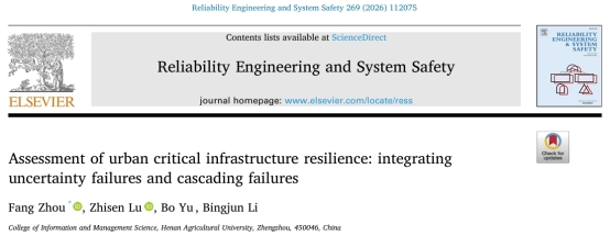 李炳军团队在不确定影响下的城市韧性研究方面取得了新进展。相关研究成果以“Assessment of urban critical infrastructure resilience: integrating uncertainty failures and cascading failures”为题,发表于国际知名期刊《Reliability Engineering & System Safety》。该研究为城市关键基础设施韧性评估提供了量化工具,助力识别脆弱区域与关键节点;提出的优化策略可为城市规划与风险管理提供科学依据,提升城市应对极端事件的能力。