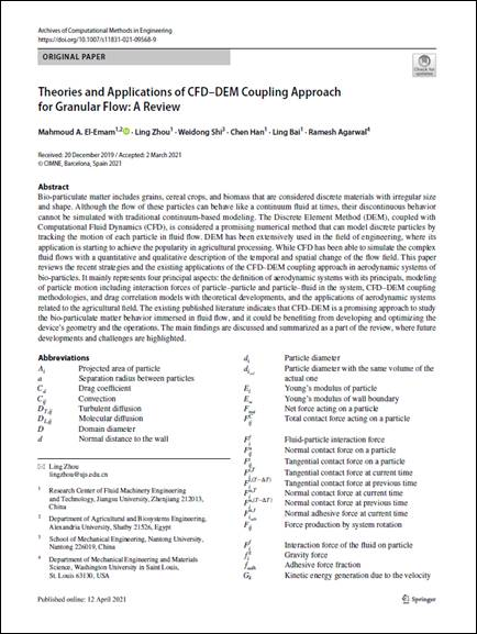 近日,银河app 周岭副研究员在国际知名工程计算方法综述期刊Archives of Computational Methods in Engineering(IF=6.73)在线发表题为“Theories and Applications of CFD–DEM Coupling Approach for Granular Flow: A Review”的综述论文。该文第一作者为银河app博士留学生Mahmoud El-Emam,通讯作者为周岭副研究员。